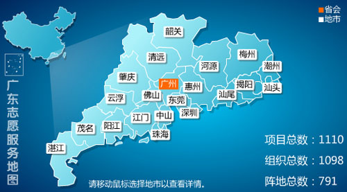 广东志愿服务地图是共青团广东省委员会、广东省志愿者联合会共同打造的全国首个“志愿服务地图”,它以广东各县(市、区)的行政地图为背景,通过图文并茂的方式,展现全省各地志愿服务项目、活动组织和阵地的分布情况及相关信息。团省委、省志愿者联合会发动全省首批1110个志愿服务项目、1080个志愿者组织和791个志愿服务阵地作为服务网点,并依托这些网点引导市民群众就近就便地参与志愿服务。广东志愿服务地图的推出是广东志愿服务走向新时期新阶段的重要标志,在引导广大市民群众就近就便参与志愿服务的同时,实现了志愿服务资源的科学配置和有效管理,将成为推进枢纽型志愿者组织建设的重要抓手。目前,团省委、省志愿者联合会已收集整理全省各地志愿服务地图,并上传至广东志愿者网(网址:www.gdcyl.org/zyz/)供广大市民免费下载、查看和使用。