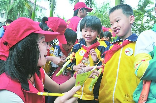 昨日一早,大爱茂名志愿者服务总队和茂名石化阳光志愿者服务总队兵分两路,分别来到羊角镇中心小学和七迳镇马鹿小学、潭波逻小学,同时举行了开营仪式。记者在羊角镇中心小学看到,该校50名留守儿童看到志愿者的到来,个个兴高采烈。该校一位老师说:“不少学生知道今天不但要去参观茂名石化乙烯厂、茂名石化港口分部和游第一滩,还可以看喜剧电影,他们昨晚都兴奋得睡不着呢。”紧接着,每名志愿者与该校两名留守儿童进行自由结对,为学生们配戴起朝阳丝巾和朝阳胸章,还与学生们开展了几个以感恩励志为目的的互动游戏。期间,一名志愿者还用自带的笔记本电脑上网,让一对留守儿童姐弟在网上与其父母相见,场面感人。