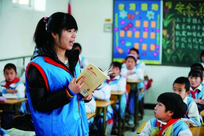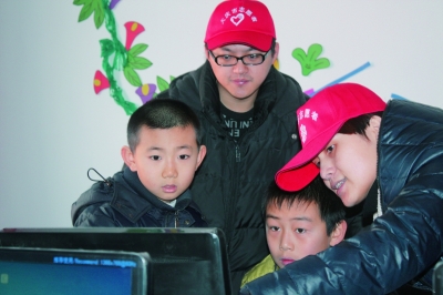 2011年3月2日,“志愿北京之蓝天行动”北京共青团关爱农民工子女志愿活动启动。图为志愿者在“爱心课堂”讲课。