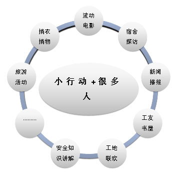 项目计划用一年时间,在北京建筑工地集中区域为建筑工人开展志愿服务活动。项目将充分动员北京高校的资源,以高校师生提供志愿服务的形式,和高校周边的建筑工地建立长期的联系,在工地上以工友书屋为依托,开展图书借阅、流动电影院、新闻播报、科技与法律知识普及、青年建筑工成人高考辅导、工地联欢等活动,丰富青年建筑工人的业余生活,提高他们的科学文化知识、城市生活技能等。同时,组织青年建筑工人走进高校、走进城市社区,增进青年学生和社会其他群体对建筑工人的沟通和理解,促进青年农民工对城市的了解,使他们能够更好地融入城市生活,分享改革发展的成果。