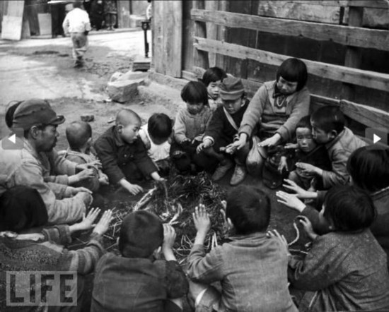 1945年9月,被原子弹袭击过后的广岛郊区,一群无家可归的儿童蜷缩在一起用火取暖。
