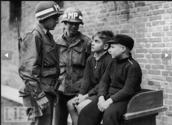 1944年在德国亚琛,美军士兵监视着两名儿童,并教他们一些有关狙击方面的东西。这两名儿童是希特勒青年团的成员。