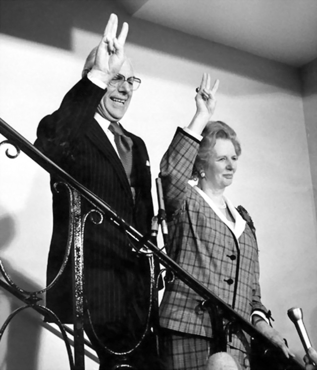 1989年,撒切尔夫人和丈夫丹尼斯共同庆祝保守党的第三次获选。撒切尔夫人在1989年保守党党内选举中继续以压倒性优势连任领袖。