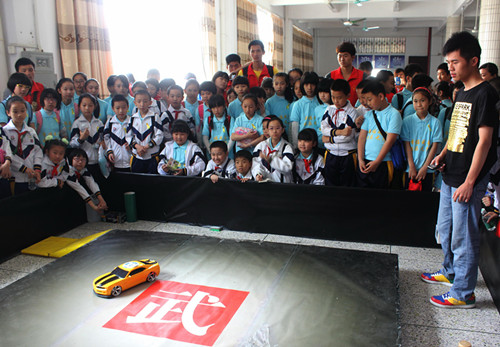 在创新活动中心,工作人员向小学生展示了自主研发制作的机器人。舞蹈机器人身形笨重,却随音乐舞动“机器舞”,做出灵巧的舞蹈动作,还做起俯卧撑、倒立等各种高难度动作。蓝牙小车、爬墙小车、无差别小车、飞机等机器也使得观展小学生发出阵阵惊叹。他们十分珍惜此次近距离观察、接触、操作机器人的机会,询问、讨论原理,不亦乐乎。