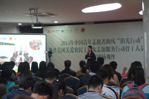 4月23日至29日,2014年中国青年志愿者助残“阳光行动”暨共青团关爱农民工子女志愿服务行动骨干人员培训班在全国青少年井冈山革命传统教育基地和江苏宜兴分期举办,来自31个省区市和兵团团委志愿者工作机构负责同志,333个市地州盟团委志愿者工作分管或负责同志,6大系统80家重点单位团委负责同志,北京、天津、上海、重庆4个直辖市87个区县团委负责同志,部分重点项目实施高校团委负责人,关爱行动优秀项目专员或助残志愿服务组织负责人代表共约630人参加了此次培训班。团中央书记处书记汪鸿雁出席开班式并讲话。