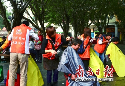 在长堤青年广场的榕树下,义剪服务队成员正忙碌着为前来的市民免费剪发。据了解,本次“万名义工献爱心”活动主办方组织了义修、义剪、义诊等便民服务,还为市民送上急救展示、防身擒拿术展示等知识普及表演,并通过手工坊、环保游戏、流动书吧等让市民参与其中。