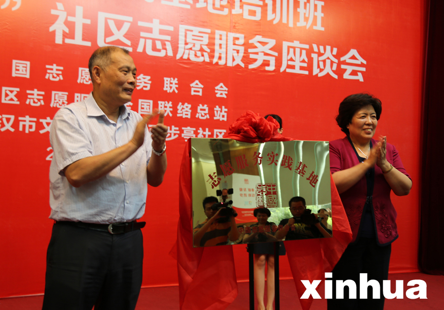 6日,中国志愿服务联合会副会长兼秘书长赵津芳(右)、武汉市委宣传部副部长和晓曦为全国首个志愿服务基地揭牌。