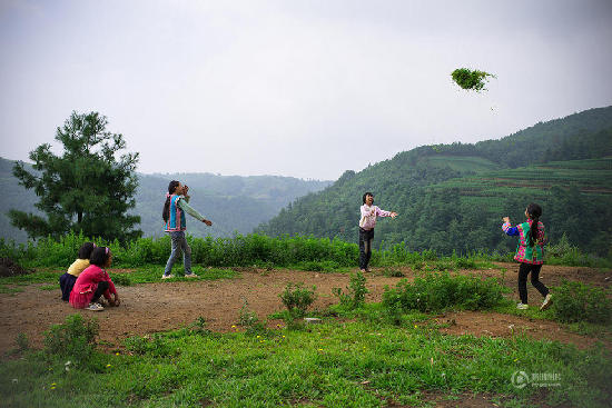 杨芬(右二),12岁,在瓦房完小读5年级。太阳落山前她会和小伙伴们在空地上玩草球。草球用植物草做成,再用小绳子绑一下,一般3-5个人玩,游戏规则是互相抛接草球。她的妈妈在昆明打工,一周给20元钱,存了100多元钱,准备买一件衣服送给爸爸,因为爸爸在家很辛苦。她的愿望是得到一个生日蛋糕,以前在学校只吃过一次老师给的生日蛋糕。长大后想好好干活,赚很多钱,有钱了家人就可以过上好日子。