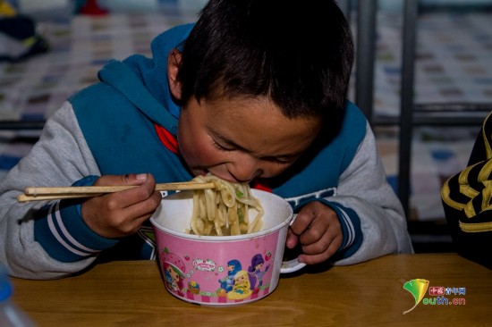 图为一个孩子抱着饭缸子狼吞虎咽,虽然只是简单的面条,但是孩子们却吃的很香。