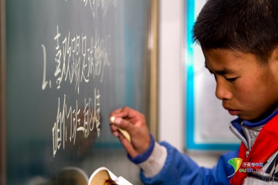 晚自习上,一名学生正在抄写题目。“喜欢足球......”