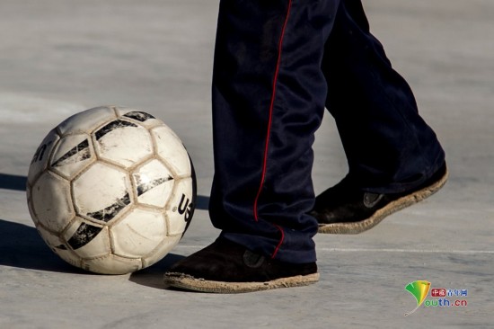 一个孩子穿着妈妈做的布鞋在踢球。其实大部分孩子都有球鞋,但是他们却舍不得穿。