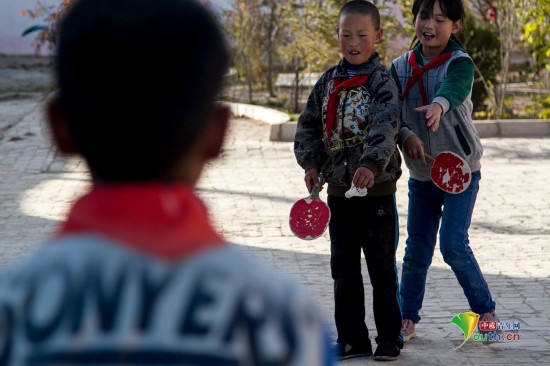 没有去踢球的孩子们在自行活动,由于体育器材匮乏,他们只能用乒乓球拍打羽毛球。