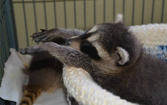 凯蒂说:“一开始人们把毛线窝给鸟类和一些很小哺乳动物使用,比如松鼠,兔子,但是慢慢的开始有人为蝙蝠,袋鼠,负鼠等动物编巢。”图为一只受到救助的浣熊。(网页截图)