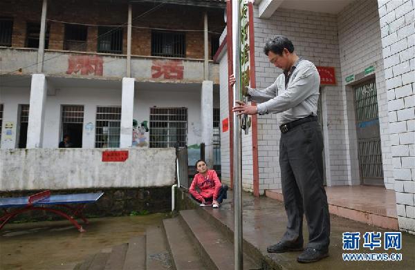 4月12日,三元岭小学进行第一次升旗仪式,杨敏的父亲杨必先从鲤溪镇中心完小赶到三元岭小学,帮忙固定旗杆上的绳子。新华社记者李尕 摄
