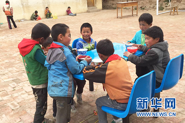 午饭的时候,孩子们在刚刚组装完毕的餐座椅前吃饭。下午,志愿者们将会把餐桌椅移到室内,以后孩子们就可以坐在室内用餐了。
