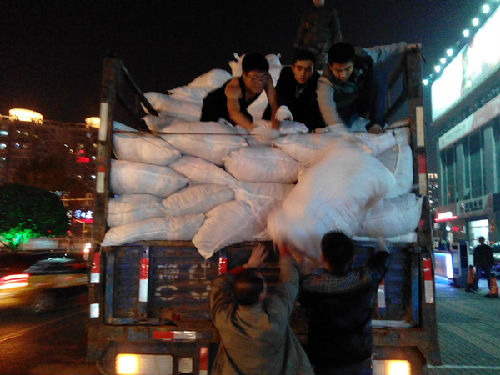 志愿者夜晚加班整理物资并装车 刘子潇摄