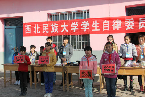 2009年起,西北民族大学学生自律委员会设立爱心基金,每学期都会向西北民族大学榆中校区周边农村小学和贫困家庭捐献爱心基金和物资,爱心基金主要来源于自律委员会同学们的捐款。在第19个民族团结进步教育月活动之际,学校自律委员会再次开展爱心捐赠活动,为孙丽珊等四位同学共捐助1100元爱心基金。正如孙家营小学校长说:“这次捐赠,温暖了许多孩子的冬天。”(编辑 徐浩)