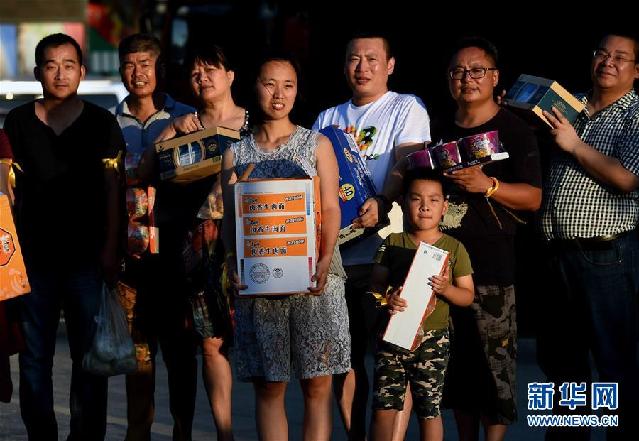 7月7日,在受灾较严重的宜兴市西渚镇,“小红豆”(左四)与志愿者团队成员在向受灾群众派送物资前合影。新华社记者 韩瑜庆摄