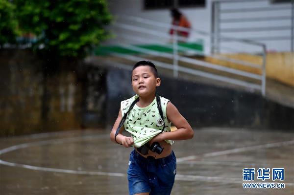 弄勇小学三年级学生刘顺杰用衣服遮住相机在雨中奔跑(9月1日摄)。今年5月份,来自北京“爱心同盟”的爱心人士为广西大化瑶族自治县板升乡弄勇小学捐赠了一批相机,帮助学校成立“摄影梦想社”,孩子们开始学习使用相机记录校园和暑假生活的点点滴滴。几个月来,这些贫困山区的孩子们,用自己独特的视角,体验做为一名“小摄影师”的快乐。新华社记者黄孝邦摄