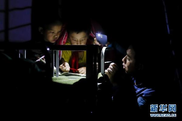 在云南省怒江傈僳族自治州贡山独龙族怒族自治县捧当乡捧当中心校,桑磊(右一)在查夜时发现两名男生在讨论没听懂的课堂内容,桑磊为他们讲解后,督促他们快快睡觉(9月27日摄)。新华社记者沈伯韩 摄